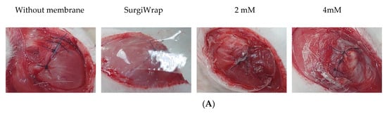 The GHF membranes were expected to rapidly reach a steady hydration state, have moderate mechanical strength, and degrade slowly in the release of the impregnated farnesol, thereby promoting the healing of RC tears. As shown in Figure 2A,B, the water content and swelling ratio of the GHF and SurgiWrap membranes reached their hydration equilibrium within 60 min. The water content and swelling ratio of the GHF membranes were significantly higher than those of the SurgiWrap membrane. Notably, the GHF membrane impregnated with 4 mM farnesol had the highest water content and swelling ratio and quickly reached steady equilibrium (within 10 min). The GHF membranes were malleable, allowing smooth affixation to the surgical site, indicating their ease of use in clinical settings, including surgical procedures (Figure 3A). By contrast, the SurgiWrap membrane, which had a lower water content and swelling ratio, could not effectively cover the surgical site.