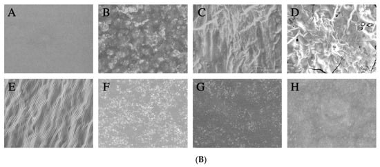 (A) Coverage of the GHF and SurgiWrap membranes after RC tear operation; the membranes impregnated with 2 and 4 mM farnesol fit smoothly on the tear sites. SurgiWrap was not malleable, preventing close attachment to the tear site; (B) SEM images of the SurgiWrap and GHF membranes before (upper lane, A: SurgiWrap, B: pure GHF membrane, C: 2 mM GHF membrane and D: 4 mM GHF membrane) and after (lower lane, E: SurgiWrap, F: pure GHF membrane, G: 2 mM GHF membrane and H: 4 mM GHF membrane) immersion in PBS solution for 24 h (surface section). RC: rotator cuff; GHF membranes: farnesol-impregnated hydrogel membranes containing hyaluronic acid or gellan gum; PBS: phosphate-buffered saline; SEM: scanning electron microscopy. Magnification: 500×.