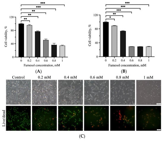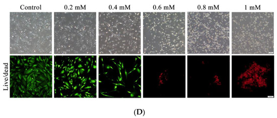 Cell viability determined using the MTT assay for (A) C2C12 myoblasts and (B) tenocytes after treatment with 0.2–1.0 mM farnesol over 24 h. Live/dead cell staining for (C) C2C12 myoblasts and (D) tenocytes. Green and red indicate live and dead cells, respectively. Significant differences are based on comparisons with the control group (without addition of farnesol), * p < 0.05, ** p < 0.01, and *** p < 0.001. Scale bar: 50 μm.