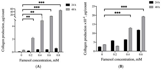This study examined the ability of farnesol to promote collagen production and exert anti-inflammatory effects. Collagen production was quantified using the Sircol Soluble Collagen Assay. The C2C12 myoblasts did not exhibit a notable increase in collagen production during the initial 24 h treatment. After treatment for 48 h, 0.2–0.8 mM farnesol significantly increased collagen production (approximately 11.1 to 37.9 times). Similarly, a higher concentration of farnesol triggered greater collagen secretion in tenocytes; however, the tenocytes secreted considerably less collagen than did the C2C12 myoblasts. In short, farnesol promoted collagen production in these cells (Figure 5A,B).