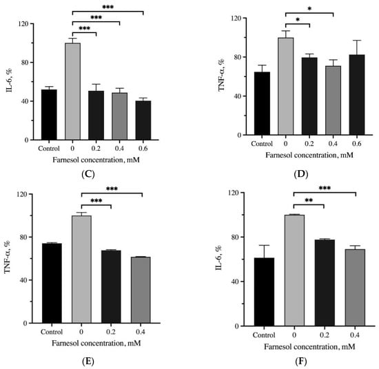 Effects of farnesol on collagen production in (A) C2C12 myoblasts and (B) tenocytes. Significant differences are based on comparisons with the control group after 48 h incubation (without addition of farnesol), ** p < 0.01 and *** p < 0.001. Effect of the anti-inflammatory response of farnesol induced by H2O2 exposure; (C) IL-6 and (D) TNF-α expression assayed in C2C12 myoblasts; (E) IL-6 and (F) NF-α expression assayed in tenocytes. * p < 0.05, ** p < 0.01, and *** p < 0.001. IL-6: interleukin 6; TNF-α: tumor necrosis factor α.