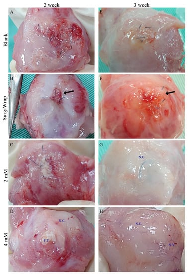Gross observation of the RC tear after 2 weeks (A: without membrane, B: covered with SurgiWarp, C: covered with 2 mM farnesol-impregnated membrane and D: covered with 4 mM farnesol-impregnated membrane) and 3 weeks (E: without membrane, F: covered with SurgiWarp, G: covered with 2 mM farnesol-impregnated membrane and H: covered with 4 mM farnesol-impregnated membrane) of healing. Black arrows indicate sutured RC tears. RC: rotator cuff; F.T.: fibrous issue; N.C.: newly generated connective tissue; N.V.: newly generated vessel.