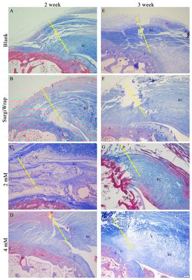 Masson’s trichrome staining of RC tear repair 2 weeks (A: without membrane, B: covered with SurgiWarp, C: covered with 2 mM farnesol-impregnated membrane and D: covered with 4 mM farnesol-impregnated membrane) and 3 weeks (E: without membrane, F: covered with SurgiWarp, G: covered with 2 mM farnesol-impregnated membrane and H: covered with 4 mM farnesol-impregnated membrane) postoperation after treatment with hydrogel membranes. RC: rotator cuff; V: vessel; C: cartilage. The dashed lines indicate RC tear sites. Scale bar: 200 μm.