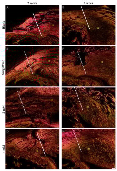 RC tears stained with picrosirius red to show type I collagen and type III collagen (bright red and green, respectively) 2 weeks (A: without membrane, B: covered with SurgiWarp, C: covered with 2 mM farnesol-impregnated membrane and D: covered with 4 mM farnesol-impregnated membrane) and 3 weeks (E: without membrane, F: covered with SurgiWarp, G: covered with 2 mM farnesol-impregnated membrane and H: covered with 4 mM farnesol-impregnated membrane) postoperation, after treatment with hydrogel membranes. RC: rotator cuff; I: type I collagen; III: type III collagen. The dashed lines indicate RC tear sites. Scale bar: 200 μm.