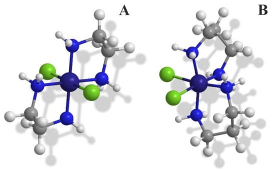 The structures of Co(III) coordination cations adopted from Ref. [5], Front. Microbiol. 2018 presented (A) trans-configuration of [CoCl2(en)2]+ (for solid state) and (B) cis-configuration of [CoCl2(dap)2]+ (for solution).