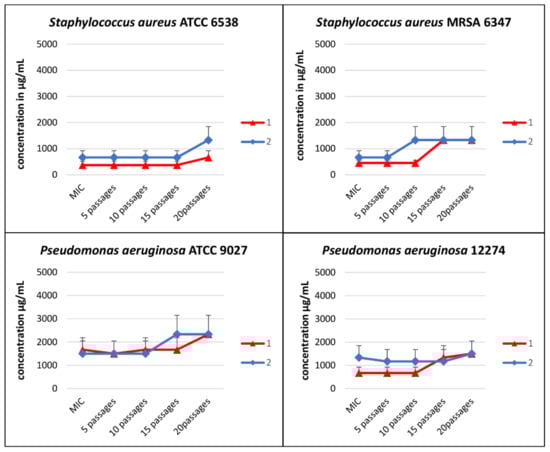 In order to assess the increase in bacterial resistance to tested compounds, a serial passages assay was performed using four strains of bacteria (S. aureus ATCC 6538, S. aureus MRSA 6347, P. aeruginosa ATCC 9027, and P. aeruginosa 12274) in a medium supplemented with (1) and (2) below their active concentrations (Table 2 and Figure 2). Each MIC value of Compounds (1) and (2) was determined by the microbroth dilution method. There was no significant increase in MIC values after 20 passages, both for Compounds (1) and (2). After 5 passages, there was no increase in the MIC value in any case (the MIC value was the same as the initial value), and after 10 passages, the MIC value doubled only in the case of S. aureus MRSA 6347 for Compound (2). The following reduction (two times) of susceptibility was observed for S. aureus MRSA 6347 and P. aeruginosa 12274 after 15 passages for Compound (1); the same results were found in the case of P. aeruginosa ATCC 9027 for Compound (2). After 20 passages, an approximately two-fold reduction in sensitivity was obtained for S. aureus ATCC 6538 (Compounds (1) and (2)) and for P. aeruginosa 12274 in the case of Compound (2). The MIC value for S. aureus MRSA 6347 increased by about three times in comparison to the initial MIC. The presented increases in bacterial resistance to the test compounds were insignificant.
