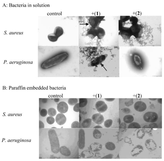 Tested bacterial strains treated for 18 h with MIC concentrations of compounds (1) and (2) were subjected to transmission electron microscopy, observed in solution and paraffin-embedded bacteria, to visualize their effect on bacterial cell morphology. After incubation in the presence of compounds (1) and (2) at the MIC level, the shape and morphology of the bacterial cells were distorted. The regular shape of the control cells was clearly visible (Figure 3A,B, control). The images of the bacterial cells treated with the tested compounds, prepared for observation in solution, showed disordered and structural disorganization within the cytoplasm (Figure 3A, +(1) and +(2)). Some cells turned from the normal round shape into irregular shapes presenting broken and lysed cells. Moreover, the cells coated probably with tested compounds were also seen (black arrows) (Figure 3A, +(1)). In the case of paraffin-embedded control bacteria, a regular shape and a cytoplasm of appropriate density inside the cells were observed (Figure 3B, control), whereas an alternation of the intracellular masses and obvious cytoplasmic clear zones were found in the bacterial cells after treatment with compounds (1) and (2) (Figure 3B, +(1), +(2)). Visible changes in bacterial cell morphology can indicate that cell membrane permeability was disrupted.