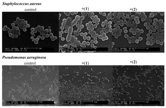 To visualize the effect of compounds (1) and (2) on bacterial cell morphology, scanning electron microscopy was carried out. S. aureus ATCC 6538 and P. aeruginosa ATCC 9027 cells were treated for 24 h with tested compounds at an MIC concentration. The SEM images of untreated cells of bacteria show a well-defined shape free of visible distortions (Figure 4, control). Treatment with both compounds induced remarkable changes in the morphology of the cells in comparison to the control probe (Figure 4, +(1) and +(2)). Deformation and altered cell morphology were observed in both cases. Cells of different sizes for the S. aureus strain and collapsing cells for the P. aeruginosa strain were observed. The surfaces of P. aeruginosa cells treated with the MIC level of both compounds were wrinkled and irregular. In the case of the microphotograph of S. aureus, malformed cells were observed. Moreover, most of the bacterium were ruptured to different degrees.