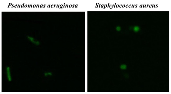 The cultures of S. aureus and P. aeruginosa were grown in LB broth until mid-log phase and then centrifuged. The bacterial pellets were washed three times using PBS buffer, pH 7.4, and resuspended in the same buffer to achieve the optical density corresponding to 106 CFU/mL. Bacterial cells were incubated with FITC-labelled [Co(dap)2]Cl2 at MIC concentration and with fluorescein alone for 1 h at 37 °C. After incubation, the cells were centrifuged, washed three times with PBS buffer, and fixed on a glass slide. After that, the cells were evaluated using Confocal microscopes from Leica Microsystems (Wetzlar, Germany) and the images were produced. The same studies were performed for fluorescein alone.