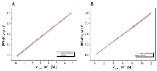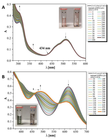 The electronic spectra were recorded on an Evolution 300 spectrophotometer (Thermo Fischer Scientific, Waltham, MA, USA) in the range of 200–700 nm in the case of UV detection of intermolecular interactions with biomolecules together with a spectral band with a 2 nm width. The binding ability of Co(III) complexes with diamines to DNA (plasmid pBR322) was investigated by spectrophotometric titration. The tris-(hydroxymethyl)-amino methane (Tris-HCl) buffer, pH 7.39, was used to prepare a solution of DNA. The concentration of freshly prepared DNA was calculated using an absorbance value at 258 nm according to the buffer solvent used (Figures S1 and S2, Supplementary Materials) and the calibration curve, which indicates the DNA molar absorption coefficient (εDNA 6600 M−1 cm−1) [40,41]. The spectrophotometric titrations were performed at room temperature by gradually increasing the DNA concentration and constant concentrations of the complexes studied. Additionally, a second type of spectrophotometric titration, where a constant concentration of DNA and a gradual increase of [CoCl2(dap)2]Cl were maintained, was prepared to check the possibility of interaction between this coordination compound and DNA (Figure S3). After each addition of a different amount of DNA solution, electronic absorption spectra were recorded (Figures S11 and S12). The calculations were always made from the experimental titration data measured in the absence of any precipitate in the solution.