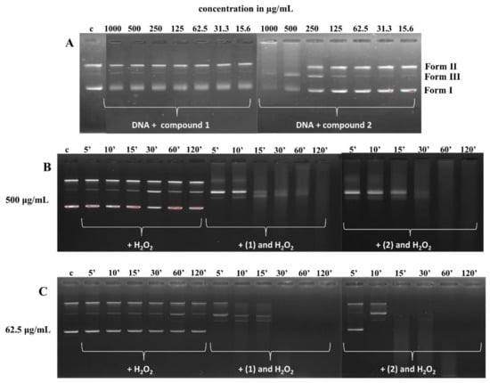 Agarose gel electrophoresis was used to evaluate the Co (III) complexes’ DNA cleavage ability. We used plasmid pBR322 isolated from E. coli DH5α by Plasmid Midi AX (A&A Biotechnology, Gdańsk, Poland). The concentration of freshly prepared DNA was measured with a spectrophotometer (Infinite M200 PRO by Tecan, Männedorf, Switzerland) using an absorbance at a 260 and 280 nm value according to the solvent buffer (Tris-HCl/NaCl 5 mM/50 mM). Dilution in the geometric progression of the tested compounds were prepared in the final concentration ranged from 1000 to 15.6 µg/mL and were mixed with the DNA at a constant concentration (62.5 µg/mL). The mixtures of DNA and Co(III) complexes were incubated at 37 °C for 2 h. To enhance the DNA cleaving ability by the complexes, H2O2 (100 µM) was added to each sample (two concentrations were examined, 500 and 62.5 µg/mL of complexes) and incubated for 5, 10, 15, 30, 60, and 120 min in 37 °C. Controls with DNA and H2O2 (100 µM) without compounds were also performed. After incubation, the samples were analysed by 0.8% agarose gel electrophoresis in 0.5% TAE buffer for 3 h at 50 V and then detected by a UV illuminator (ChemiDocTM Touch Imaging System Bio-Rad, Hercules, California, United States).
