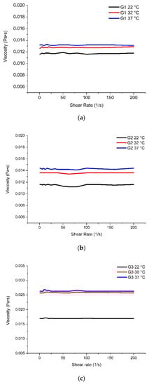 The dynamic viscosity (Pa·s) vs. shear rate (1/s) in different (22 °C, 32 °C, and 37 °C) temperatures of in situ gels: (a) G1; (b) G2; (c) G3; (d) G4; (e) G5; and (f) G6.