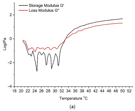 In situ gels’ gelation temperatures (storage modulus(G′), loss modulus (G″)). (a) G2 gel; (b) G6 gel.