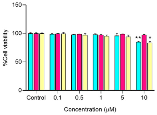 Cell viability of Caco-2 cells incubated with CUR, MPA, and MPA-CUR over a concentration range of 0.1–10 μM for 24 h. Data presented are mean ± SD values of four replicates * p < 0.05 and ** p < 0.01 indicates significance from the control group.