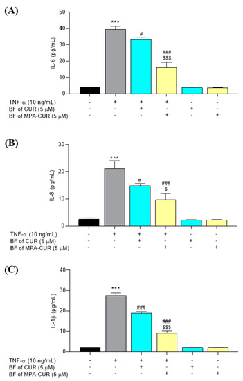 The effects of the BF of MPA-CUR on the expression of inflammatory cytokines, IL-6, IL-8, and IL-1β, following treatment with TNF-α in HaCaT cells (A–C). Data presented are mean ± SD values of three replicates *** p < 0.001 indicates significance from the untreated control cells, # p < 0.05 and ### p < 0.001 indicates significance from the TNF-α control group and $ p < 0.05 and $$$ p < 0.001 indicates significance from the BF of CUR treated group.