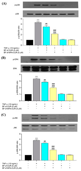 TNF-α is a cytokine that activates various signaling pathways, including MAPK, resulting in keratinocyte inflammation. To further determine the mechanism underlying the anti-inflammatory effects of the BF of MPA-CUR, we evaluated the role of MAPK signaling cascades in TNF-α-inflammatory responses in HaCaT cells. TNF-α exposure significantly increased p38 (p < 0.001), ERK (p < 0.001), and JNK (p < 0.001) phosphorylation in HaCaT cells after 24-h treatment followed by 24-h incubation compared to the untreated cells. The BF of MPA-CUR significantly reduced (p < 0.001) the TNF-α induced phosphorylation of all three proteins, i.e., p38, ERK and JNK (50, 41, and 48%, respectively), significantly greater (p < 0.001) than that of the BF of CUR (Figure 7).