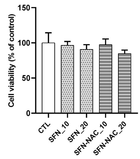 Effect of SFN and SFN-NAC on cell viability of MRC-5 fibroblast cells. The cells were treated with indicated concentrations (10 and 20 μM) of SFN and SFN-NAC for 48 h. Data values are expressed as the mean ± standard deviation of at least three different experiments. SFN, sulforaphane; SFN-NAC, sulforaphane N-acetylcysteine; CTL, control.