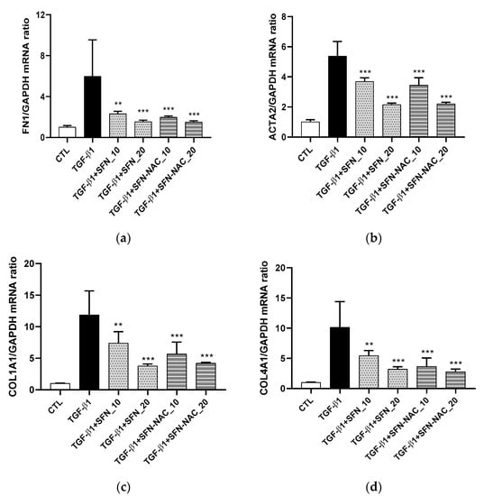 Effect of SFN and SFN-NAC treatment on the mRNA expression of ECM proteins and myofibroblast marker following TGF-β1-induced fibrosis in MRC-5 fibroblast cells. The cells were pre-treated for 1 h with the indicated concentrations of SFN and SFN-NAC, followed by treatment with TGF-β1 (5 ng/mL) for 48 h. mRNA levels of FN1 (a), ACTA2 (b), COL1A1 (c), and COL4A1 (d) were measured by qRT-PCR. Data values are expressed as the mean ± standard deviation of at least three different experiments. ** p < 0.01, *** p < 0.001 versus TGF-β1 induction. ECM, extracellular proteins; TGF-β1, transforming growth factor-β1; SFN, sulforaphane; SFN-NAC, sulforaphane N-acetylcysteine; CTL, control; FN1, fibronectin 1; ACTA2, actin alpha2, smooth muscle; COL1A1, type I collagen; COL4A1, type IV collagen.