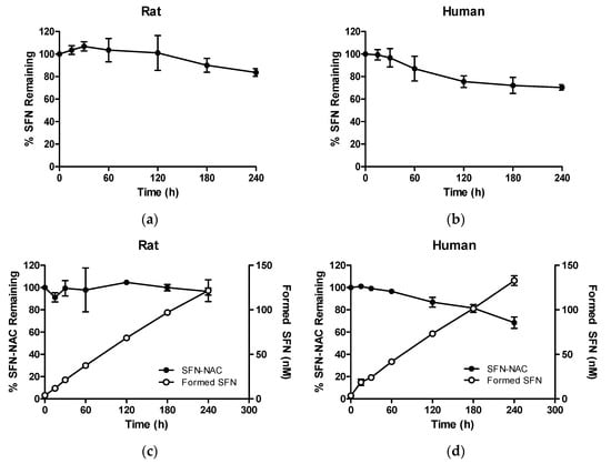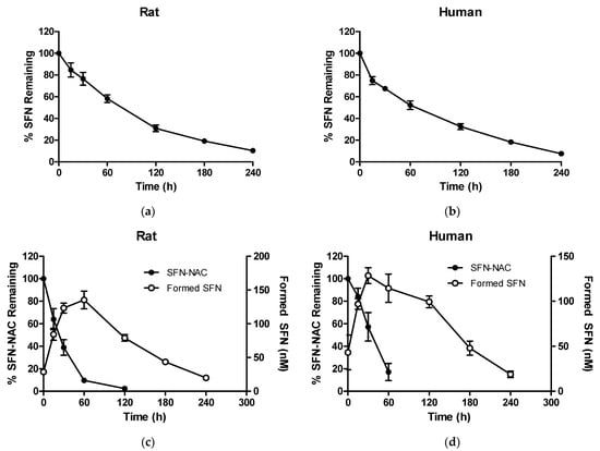 SFN levels were reduced in rat and human plasma, presenting mean half-lives of 76.0 and 57.4 min, respectively (Figure 5a,b). The plasma level of SFN-NAC decreased faster than that of SFN, with mean half-lives of 23.3 and 19.0 min, respectively. In both rat and human plasma, SFN was formed after incubation with SFN-NAC. The concentration of the formed SFN increased and then decreased again in a similar manner to that following incubation with SFN (Figure 5c,d).