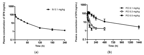 After intravenous administration of 0.1 mg/kg SFN, the SFN plasma concentration declined exponentially, with a terminal half-life of 61.3 min (Figure 8a and Table 1). The total body clearance of SFN was 40.7 mL/min/kg. After oral administration of SFN at 0.1, 0.2, and 0.5 mg/kg, the Tmax ranged between 5–30 min for the three different doses. The increase in the oral AUC of SFN was more than dose-proportional, indicating non-linear pharmacokinetics of SFN even in the low dose range (Figure 8b and Table 1). Thus, the calculated oral bioavailability was similar, between 0.1 mg/kg and 0.2 mg/kg, whereas the oral bioavailability was higher than 100% at the highest dose (0.5 mg/kg).