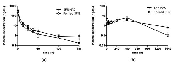 After intravenous administration of 0.1 mg/kg SFN-NAC, the plasma concentration of SFN declined exponentially, presenting a terminal half-life of 33.2 min (Figure 9a and Table 2). The total body clearance of SFN-NAC was 48.3 mL/min/kg, similar to that of SFN. The plasma concentration of the formed SFN was determined after administering SFN-NAC. SFN was rapidly formed from SFN-NAC and decreased in a similar pattern and concentration range to SFN-NAC. The half-life of the formed SFN was 48.6 min, which approaches that of SFN after an oral dose of 0.1 mg/kg (Table 1 and Table 2).