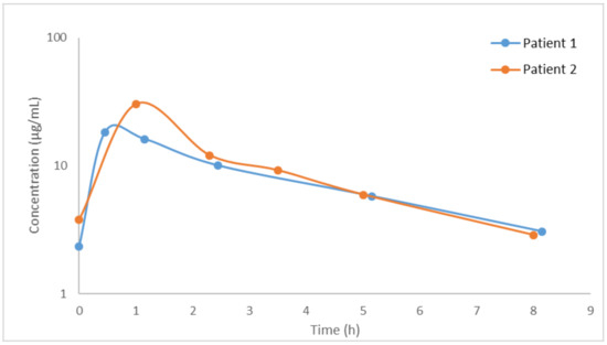 Once the method was validated, it was applied to quantify ceftaroline in plasma samples from two critically ill patients diagnosed with pneumonia and treated with 600 mg of ceftaroline fosamil every 8 h. The samples were adequately analyzed, resulting in the concentrations of all samples being within the linearity range of the calibration curve. From the concentration data, a non-compartmental analysis was carried out to determine the pharmacokinetic parameters. The two patients presented a similar value of CLT (8.84 and 7.33 L/h). The highest differences in the PK parameters of the two patients were detected for Cmax (18.22 and 30.28 µg/mL) and for Vss (36.40 and 23.61 L). In this sense, it is important to take into account that pharmacokinetics of drugs in critically ill patients is highly variable [26,27,28,29,30]. The pharmacokinetic parameters of ceftaroline in our patients were of the same order as those reported in healthy subjects [12]. A recent study [24] described the PK of ceftaroline in critically ill patients undergoing continuous renal replacement therapy and treated with ceftaroline (400 mg every 8 h or 400 mg every 12 h). In spite of the different characteristics of these patients, the CLT reported (ranging from 6.99 to 8.02 L/h, n = 4) was similar to that obtained in our patients (8.84 and 7.33 L/h). To the knowledge of the authors, no other study has reported the pharmacokinetics of ceftaroline in critically ill patients.