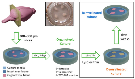 In general, in vitro models may be constructed with increasing degrees of complexity, starting from specific cell-type monocultures and scaling to complex co-cultures (including the physical separation of cells by permeable membranes, flowing fluids, etc.), organoids, perfused excised organs or tissues, and 3D bioprinted structures. Despite multiple in vitro models having been successfully reported in the literature for the study of the central nervous system (CNS) [2], for myelin-related diseases, it is important to replicate the complex multifaceted nature of the brain, with strong interactions among its components, a task that is difficult to achieve using just cell cultures. In this case, ex vivo excised brain sections transformed into organotypic brain cultures (OBCs) have been proposed as a more realistic setting, in which glia closely interact with neuronal axons in a three-dimensional space [3]. Thus, OBCs have become a simplified way to study de- and remyelination processes and are generally considered a suitable tool for the evaluation of therapies against myelin-related diseases [4].