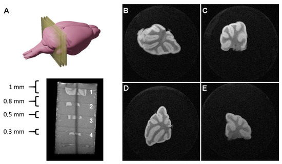 MR imaging of thick tissue slices: (A) mouse cerebellum tissue slices excised at different thicknesses and stacked in agar (sagittal MR image); (B–E) coronal MRI 2D images (300 µm slice thickness) acquired at two in-plane resolutions. White matter structures (hypointense on T2w imaging) are clearly distinguishable from gray matter.