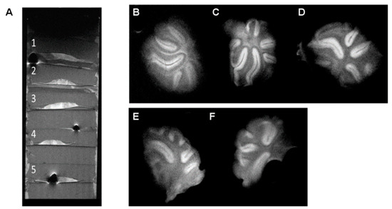 MR imaging of thick organotypic cultures: (A) sagittal MR image of five mouse cerebellum organotypic cultures stacked in agar (sagittal MR image); (B–F) coronal MRI 2D images (300 µm slice thickness) of the organotypic slices. The white matter–gray matter limit blurred as the cultured tissues evolved.