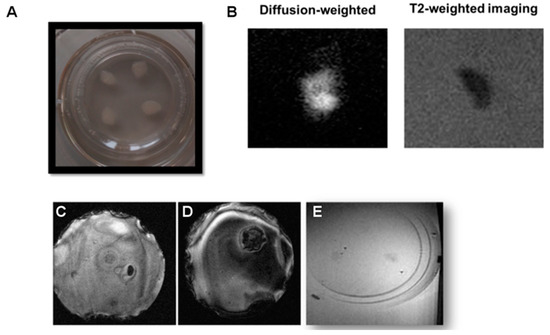 MR imaging of thin organotypic slices. (A) A photograph of organotypic slices in culture. (B) Diffusion-weighted vs. T2-weighted imaging of an organotypic slice. (C–E) Different imaging artifacts observed when imaging thin tissue slices ((C) air bubble; (D) misalignment of the supporting membrane with imaging plane; (E) loss of CNR due to partial volume effects).