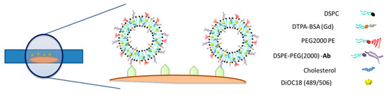 Liposomes doped with imaging probes (gadolinium for MRI detection and a fluorescence probe for microscopy) and decorated with antimyelin basic protein antibody (anti-MBP) were prepared (as well as liposomes decorated with unspecific anti-IgG protein as a control) and incubated with thin organotypic tissues (Figure 5), as described in Section 2.