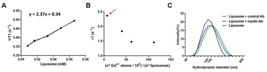 Characterization of liposomes. (A) Relaxation rate vs. concentration plots. (B) Longitudinal relaxivity vs. load of gadolinium plot, of prepared liposomes. (C) Hydrodynamic diameters of liposomes, as determined by DLS.