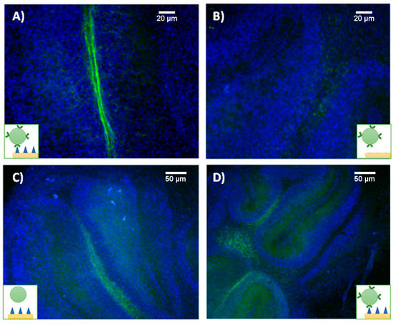 Fluorescence imaging of tissue sections (blue for cell nuclei and green from DIOC18 fluorescent liposomes) incubated with targeting liposomes. (A) Healthy and (B) demyelinated tissues, incubated with fluorescent anti-MBP liposomes. (C) Healthy tissues incubated with control anti-IgG and (D) with antimyelin basic protein liposomes.