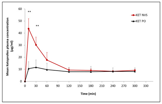 Pharmacokinetic profile of Ketoprofen in plasma following nasal administration of the drug nanovesicular system (KET-NVS), as compared to oral preparation (KET-PO), each at a drug dose of 14 mg/kg, (n, 5 for each group), (Mean ± SD). ** p < 0.01 KET-NVS vs. KET-PO at 10 min, and 30 min.
