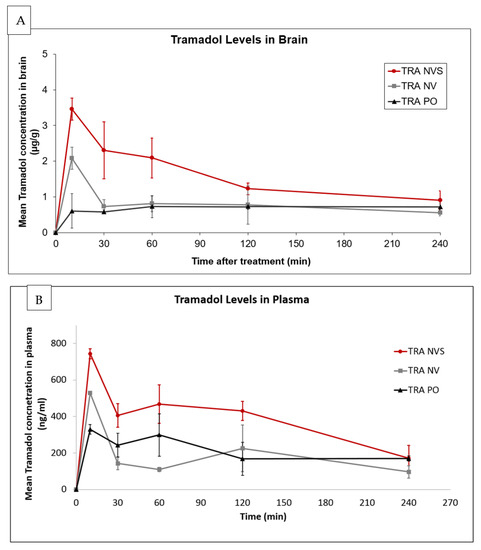 Pharmacokinetic profiles of Tramadol in (A) brain and (B) plasma following administration of the drug in the nasal nanovesicular system (TRA NVS) as compared to nasal non-vesicular system (TRA NV) and to oral administration (TRA PO), each at a drug dose of 7 mg/kg; mean ± SD; n, 5/group. (A) p < 0.01 for NVS vs. NV and 10, 30 and 60 min, and vs. PO at 10 min and 30 min; (B) p < 0.01 for NVS vs. NV and PO at 10–120 min.