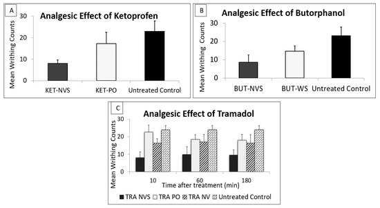 Mean writing counts in mice treated with (A) Ketoprofen nasal nanovesicular system (KET-NVS), vs. oral drug administration (KET-PO), each at a dose of 11 mg/kg, 30 min prior to i.p. injection of acetic acid and compared to untreated mice, (n, 4/each group). (B) Butorphanol nanovesicular system (BUT-NVS), vs. water solution (BUT-WS), each at a dose of 0.15 mg/kg, 10 min prior to i.p. injection of acetic acid and compared to untreated control mice, (n, 5/each group). (C) Tramadol at a dose of 5 mg/kg in Nasal Nanovesicular carrier (TRA NVS), Nasal non-vesicular system (TRA NV), Oral preparation (TRA PO) and untreated mice 10, 60 and 180 min prior to i.p. injection of acetic acid; (n, 5/each group), mean ± SD. p < 0.05 for KET-NVS-treated group vs. KET-PO. p < 0.01 for KET-NVS-treated group vs. untreated control. p < 0.05 for BUT NVS vs. BUT PO, p < 0.01 for BUT NVS vs. untreated. p < 0.05 for TRA NVS vs. TRA PO, and TRA NV and untreated at all time points.