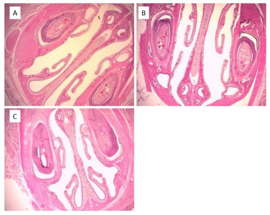 Representative micrographs of nasal cavities excised from rats (A) received no treatment (B) treated nasally with nasal nanovesicular carrier (NVS), and (C) treated nasally with normal saline (NS) (10×).
