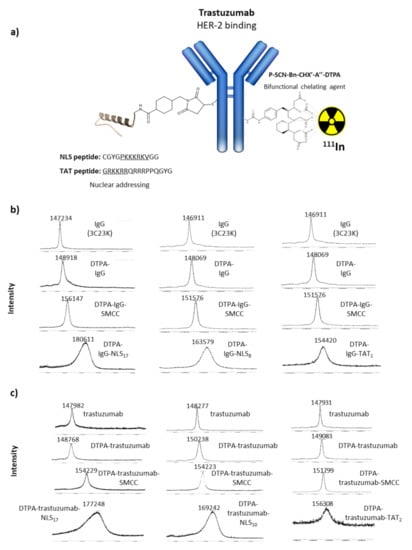 MALDI–TOF analysis of immunoconjugates. (a) Schematic representation of the DTPA-mAb-sulphoSMCC-TAT and DTPA-mAb-sulphoSMCC-NLS immunoconjugates. (b) MALDI–TOF analysis of IgG, DTPA-IgG, DTPA-IgG-sulpho-SMCC and DTPA-IgG-sulpho-SMCC-TAT, and DTPA-IgG-sulphoSMCC-NLS immunoconjugates. (c) MALDI–TOF analysis of trastuzumab, DTPA-trastuzumab, DTPA-trastuzumab-sulpho-SMCC and DTPA-trastuzumab-sulpho-SMCC-TAT, and DTPA-trastuzumab-sulphoSMCC-NLS immunoconjugates.