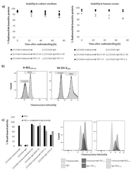 Flow cytometry analysis confirmed that HER-2 expression was higher in SK-OV-31B9 cells (G-mean: ×116 compared to control) than in A-431CEA-luc cells (G-mean: ×4.93 compared to control) (Figure 2b). Immunoreactivity assay confirmed that the binding of NLS- or TAT-immunoconjugates was predominantly non-specific because [111In]In-IgG-NLS5-10 and [111In]In-IgG-TAT1-3 bound to HER2-coated beads. Moreover, the binding of [111In]In-trastuzumab-NLS5-10 and [111In]In-trastuzumab-TAT1-3 was not strongly blocked in the presence of a large excess of unlabelled trastuzumab compared with [111In]In-trastuzumab (Figure 2c, left panel). Flow cytometry analysis of the immunoconjugate cell binding also showed that trastuzumab functionalisation with NLS5-10 or TAT1-3 peptides resulted in an increase of the fluorescence signal (G-mean: 104,042, 506,000, and 265,795 for trastuzumab, trastuzumab-NLS5-10, and trastuzumab-TAT1-3, respectively), indicating higher cell binding. However, this effect was predominantly non-specific because it was observed also after functionalisation of the non-specific IgG mAb (Figure 2c, right panel).