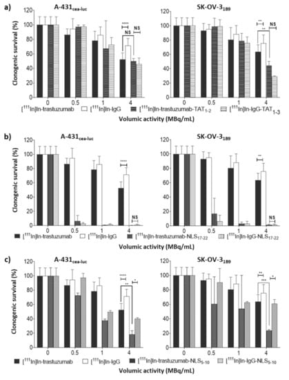 In vitro clonogenic cell death of radioimmunoconjugates. Clonogenic survival was assessed in A-431CEA-luc and SK-OV-31B9 cells 12 days after a 48 h exposure to [111In]In-trastuzumab or [111In]In-IgG, and (a) [111In]In-trastuzumab-TAT1-3 or [111In]In-IgG-TAT1-3; (b) [111In]In-trastuzumab-NLS17-22 or [111In]In-IgG-NLS17-22; (c) [111In]In-trastuzumab-NLS5-10, or [111In]In-IgG-NLS5-10 (0–4 MBq/mL; 0–10.8 µg/mL). Data are the mean ± SD. Experiments were performed at least three times in triplicate. * p ≤ 0.05, ** p ≤ 0.01, *** p ≤ 0.001, **** p ≤ 0.0001.