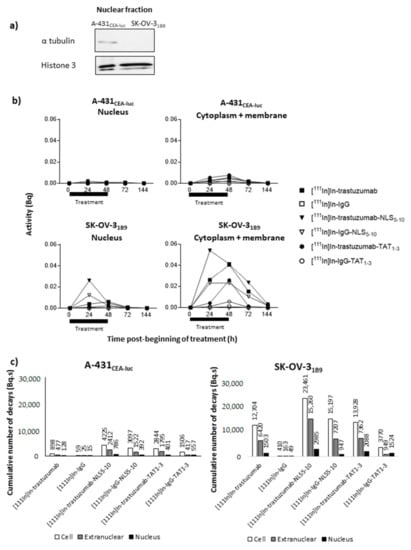 Evaluation of the nuclear and extranuclear uptake of radioactivity (a) Expression of histone 3 and α-tubulin was determined in the nuclear fraction by Western blotting to validate the nuclear-fraction isolation technique. (b) Cells were exposed to the indicated 111In-radioimmunoconjugates (0.1 MBq/mL) for 48 h. At different times post-treatment onset (from 24 h to 144 h), cells were counted and fractionated, and activities were measured in whole cells, in the nuclear fraction and in the extranuclear fraction. Using the AUC, (c) the cumulative number of decays per cell or nucleus for the different RICs was calculated in the whole cell (Ãcellular), in the cytoplasm (Ãextranuclear), and in the nucleus (Ãnuclear).