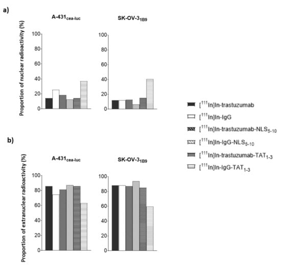The addition of NLS5-10 or TAT1-3 resulted in an overall increase of cellular, and subsequently nuclear, uptake of the non-specific IgG RIC (Figure 4c and Figure 5). Compared with [111In]In-IgG, the Ãcellular value for [111In]In-IgG-NLS5-10 was 52 times higher in A-431CEA-luc cells (versus 4.7 times for [111In]In-trastuzumab-NLS5-10 compared with [111In]In-trastuzumab) and 37 times in SK-OV-31B9 cells (versus 1.8 times for [111In]In-trastuzumab-NLS5-10, compared with [111In]In-trastuzumab). For [111In]In-IgG-TAT1-3, the Ãcellular value was 26 times higher in A-431CEA-luc cells (versus 3.2 times for [111In]In-trastuzumab-TAT1-3, compared with [111In]In-trastuzumab) and 9.2 times higher in SK-OV-31B9 cells (versus 1.1 times for [111In]In-trastuzumab-TAT1-3, compared with [111In]In-trastuzumab). The HER2-specific/non-specific Ãcellular ratios for NLS5-10 were 1.4 in A-431CEA-luc and 1.5 in SK-OV-31B9 cells. The HER2-specific/non-specific Ãcellular ratios for TAT1-3 were 1.9 in A-431CEA-luc and 3.7 in SK-OV-31B9 cells.