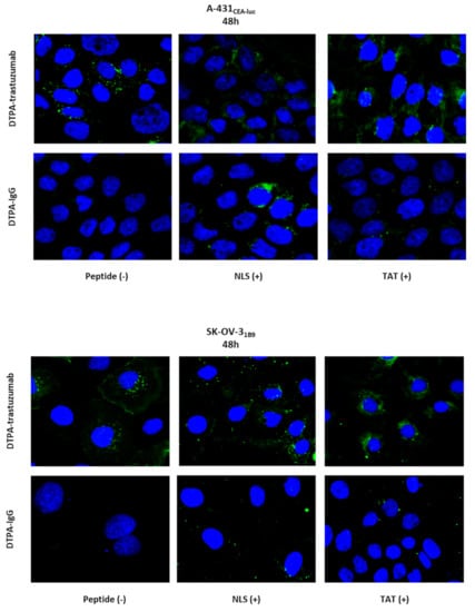 Immunofluorescence analysis of immunoconjugates 48 h after incubation onset. A-431CEA-luc and SK-OV-31B9 cells were incubated with DTPA-trastuzumab, DTPA-trastuzumab-NLS5-10, DTPA-trastuzumab-TAT1-3, or DTPA-IgG, DTPA-IgG-NLS5-10, or DTPA-IgG-TAT1-3 (10.8 µg/mL) for 48 h. Cells were fixed, permeabilised and incubated with an AlexaFluor-488-labelled anti-human IgG antibody. Images were acquired using an ×63 or ×40 objective.