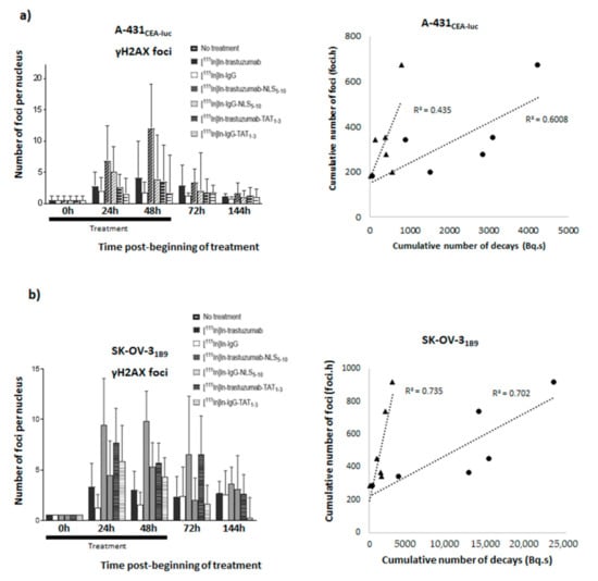 To investigate whether DNA double strand breaks (DSBs) induction by the different RICs was correlated with their Ãcellular or Ãnuclear values, γH2AX focus formation was monitored at various time points in A-431CEA-luc and SK-OV-31B9 cells by immunofluorescence analysis (Figure 7a,b, left panels). The highest yield of γH2AX foci (indicative of DNA DSBs) was observed in cells incubated with [111In]In-trastuzumab-NLS5-10 (12.0 ± 7.0 foci/cell and 9.9 ± 2.9 foci/cell in A-431CEA-luc and SK-OV-31B9 cells, respectively). In A-431CEA-luc cells, it was followed by [111In]In-IgG-NLS5-10 (5.0 ± 4.1 foci/cell), [111In]In-trastuzumab (4.1 ± 5.9 foci/cell, and [111In]In-trastuzumab-TAT1-3 (3.5 ± 5.9 foci/cell). In SK-OV-31B9 cells, it was followed by [111In]In-trastuzumab-TAT1-3 (7.7 ± 3.4 foci/cell), [111In]In -IgG-TAT1-3 (5.9 ± 3.5 foci/cell), [111In]In-IgG-NLS5-10 (5.3 ± 2.4 foci/cell), and [111In]In-trastuzumab (3.3 ± 2.3 foci/cell). For comparison, 0.4 ± 0.7 foci/cell and 2.0 ± 2.1 foci/cell were detected in untreated cells and in A-431CEA-luc cells incubated with [111In]In-IgG, respectively. The corresponding values were 0.6 ± 0.6 foci/cell and 2.6 ± 2.4 foci/cell in SK-OV-31B9 cells. Then, the cumulative number of γH2AX foci over 144 h was calculated and expressed as a function of the Ãcellular or Ãnuclear values (Figure 7a,b, right panels). Such foci increased with time, and the r2 values ranged between 0.43 and 0.75. Neither Ãcellular nor Ãnuclear appeared to be the best parameter.