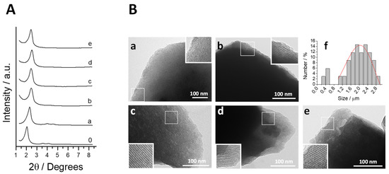 (A) Normalized powder X-ray patterns of all the synthesized solids. From bottom to top, the reported solids are the as made material (0), the calcined support M41 (a) and the loaded and functionalized final materials: M41-RhB-L (b), M41-Thy-L (c), M41-Eug-L (d) and M41-Cin-L (e). (B) TEM micrographs of starting bare material M41 (a), and loaded and functionalized solids M41-RhB-L (b), M41-Thy-L (c), M41-Eug-L (d) and M41-Cin-L (e), and particle size estimation (f). Insets correspond to a 2x magnification of the selected areas.