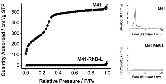 The N2 adsorption-desorption isotherm of the calcined support (M41) is shown in Figure 2. A typical curve of a mesoporous solid consisting of an adsorption step at P/P0 values between 0.1–0.3 is observed. The curve fits with a type IV isotherm, in which the increase produced in the gas absorption corresponds to a condensation of the N2 molecules within the mesopores of the inorganic structure [87]. The absence of hysteresis loop in this interval (0.1 < P/P0 < 0.3) and the narrow pore diameter distribution suggest the existence of cylindrical mesopores with a uniform structure, in which the processes of gas adsorption and desorption are developed following the same mechanism. The N2 adsorption-desorption isotherm of M41-RhB-L solid is typical of mesoporous systems with practically filled mesopores (Figure 2). The high amount of organic matter in M41-RhB-L avoids the adsorption of gas molecules, and consequently, the registered curve is completely flat. Accordingly, an absence of appreciable mesoporosity is observed and relatively low N2 adsorbed quantity and surface area values were obtained (see Table 1). Solids containing EOCs loaded into the pore voids could not be analyzed by this technique due to the EOCs volatility that would clog the porosimeter during the degassing pretreatment of the samples.