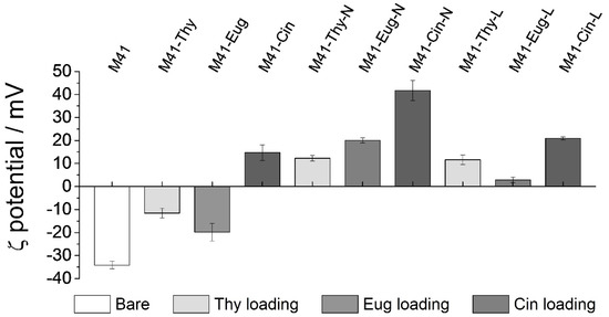 The different stages of the synthesis process, from loading to final functionalization with lactose through prior functionalization with APTES, were followed by ζ potential measurements. ζ potential (Figure 3) of the starting M41 solid is negative due to the presence of silanolate groups. This negative value is reduced for the loaded materials M41-Thy and M41-Eug. Moreover, a positive ζ potential for M41-Cin is observed, possibly due to the formation of some hemiacetal groups between the aldehyde group present in the Cin molecule and the silanolate groups in the M41-surface present at neutral pH, which compensates their initial negative charge. The alcohol which forms the active groups of Thy and Eug does not react with the M41 surface, ergo no important modifications of the surface’s charge is observed. Following with the next functionalization step, it can be appreciated how the APTES-moiety makes the external charge of the particles more positive due to the primary amines. Functionalization with lactose results in final solids still with a positive ζ potential.