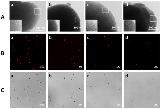 To study the possible degradation of the mesoporous support due to the aggressive environment of the digestive fluids (regardless of the triggering stimulus), the M41-RhB-L particles were studied using TEM and CLSM after each gastrointestinal step, and the obtained images are shown in Figure 5. The CLSM images were taken directly from the digestion fluids, while the samples for the TEM analysis were previously collected, washed and dried (for further details, see Section 2.5 for TEM and Section 2.15 for CLSM). TEM micrographs (Figure 5A) showed no significant changes in the M41 characteristic structure during the biofluid digestion. The typical striped structure was preserved from the initial material suspended in water (a) to the particles in the presence of saliva (b), gastric fluid (c) and finally all digestive fluids in the intestinal step (d), including duodenal fluid and bile salts. A loss of contrast was observed in the final micrograph (Figure 5A(d)), possibly due to the high amount of organic matter involved in this assay.