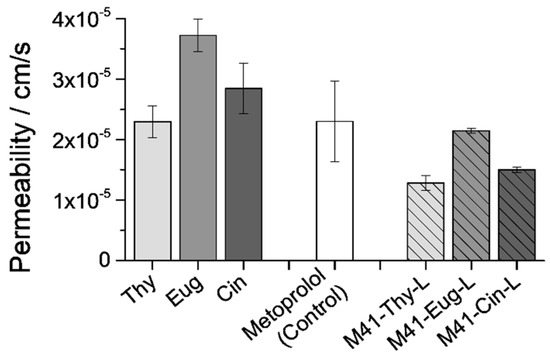 The permeability assay measures the speed of passage of a compound through the intestinal membrane, from the apical (ap) compartment to the basolateral (bl) side, during the assay time (90 min). Apical to basolateral permeability (Pab) values of EOCs were determined using the Caco-2 monolayers as an in vitro model able to predict human absorption, simulating the passage of compounds from the intestinal lumen (ap) to the plasma (bl) across the intestinal membrane [94,102]. To perform the assay, EOCs (free or encapsulated into M41-EOC-L microdevices) were placed in the ap side, and during the 90 min of incubation, different samples were taken from the bl side. Calculated Pab values of the different EOCs, both free and encapsulated into the M41-EOC-L microdevices, are shown in Figure 8, where also the Pab value of Metoprolol has been included as permeability reference standard.
