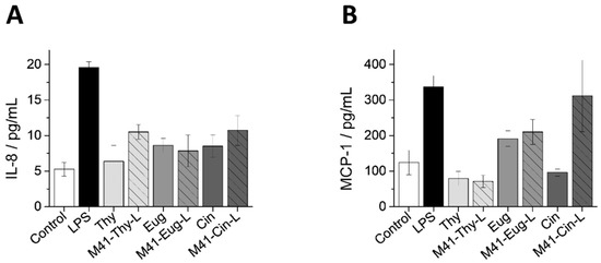 Inflammatory cytokine and chemokine release (IL-8, MCP-1) was measured in the apical media from the enterocyte layers after 24 h of treatment with the corresponding M41-EOC-L and free EOCs. For the measurement, a Bio-Plex 1 MAGPIX TM Multiplex Reader (Bio-Rad) was employed according to the manufacturer-described-procedure. The cells were stimulated with 10 μg/mL LPS as positive control.